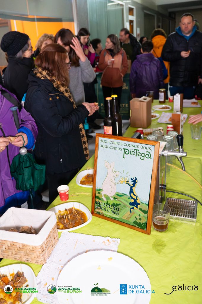 Natalia, da Herboristería San Juan, seleccionou unha mostra dos produtos locais que vende no seu establecemento; María, da gandería Vianesas D’acolá, preparou unha degustación dunha saborosa lingua estofada, que se acompañou con zumes das Ribeiregas e Cervexas Píntega, que tirou Juan Pablo. Así mesmo, tamén houbo empanadas de Branca de Nullán e as tortillas que fixo Pepita cos ovos que comercializa baixo a marca O Retiro.