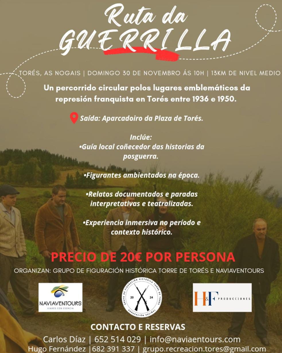O día 30 de novembro temos unha cita especial en As Nogais: unha ruta circular de 13 km que percorre os lugares máis emblemáticos da parroquia de Torés, escenario de feitos clave ligados á guerrilla antifranquista.